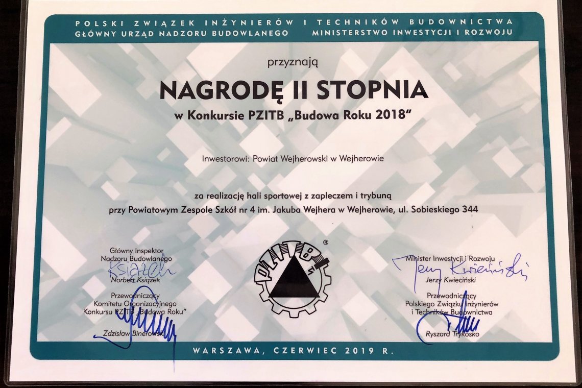 Hala sportowa przy Powiatowym Zespole Szkół nr 4 im. Jakuba Wejhera w Wejherowie otrzymała prestiżowy tytuł „Budowy Roku 2018”. Sukces jest tym większy, że powiatowa inwestycja rywalizowała z ogromnymi, nawet kilkakrotnie droższymi budowlami, finansowanymi przez międzynarodowe konsorcja.