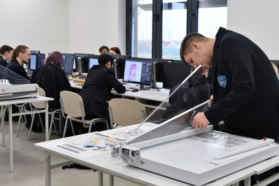 Uczniowie w pracowni przygotowania druku cyfrowego uczą się procesów związanych z drukowaniem i obróbką wykończeniową druków cyfrowych: impozycji, drukowania, bigowania, laminowania, wykrawania, zszywania. W pracowni poligraficznych procesów przygotowawczych uczniowie przygotowują projekty w programach wektorowych (CorelDraw oraz Adobe Illustrator), rastrowych (Adobe Photoshop) oraz do składu (InDesign).