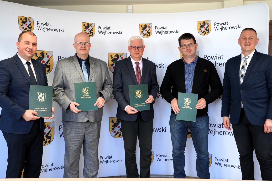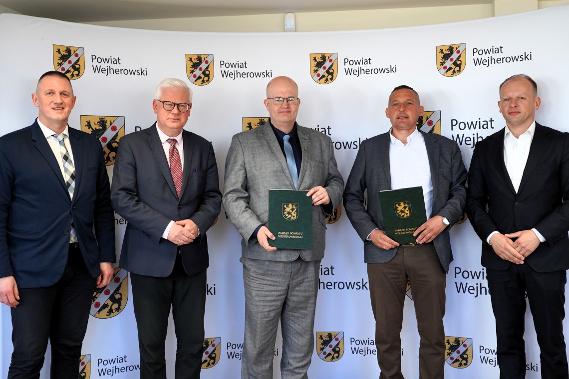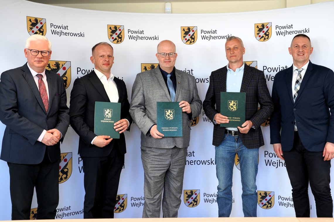 W Starostwie Powiatowym w Wejherowie podpisano umowy z wykonawcami na realizację czterech zadań drogowych: rozbudowę drogi Kielno–Kowalewo, budowę chodników Zakrzewo–Linia (prace podzielone są na dwa zadania) oraz chodnika w Bojanie.